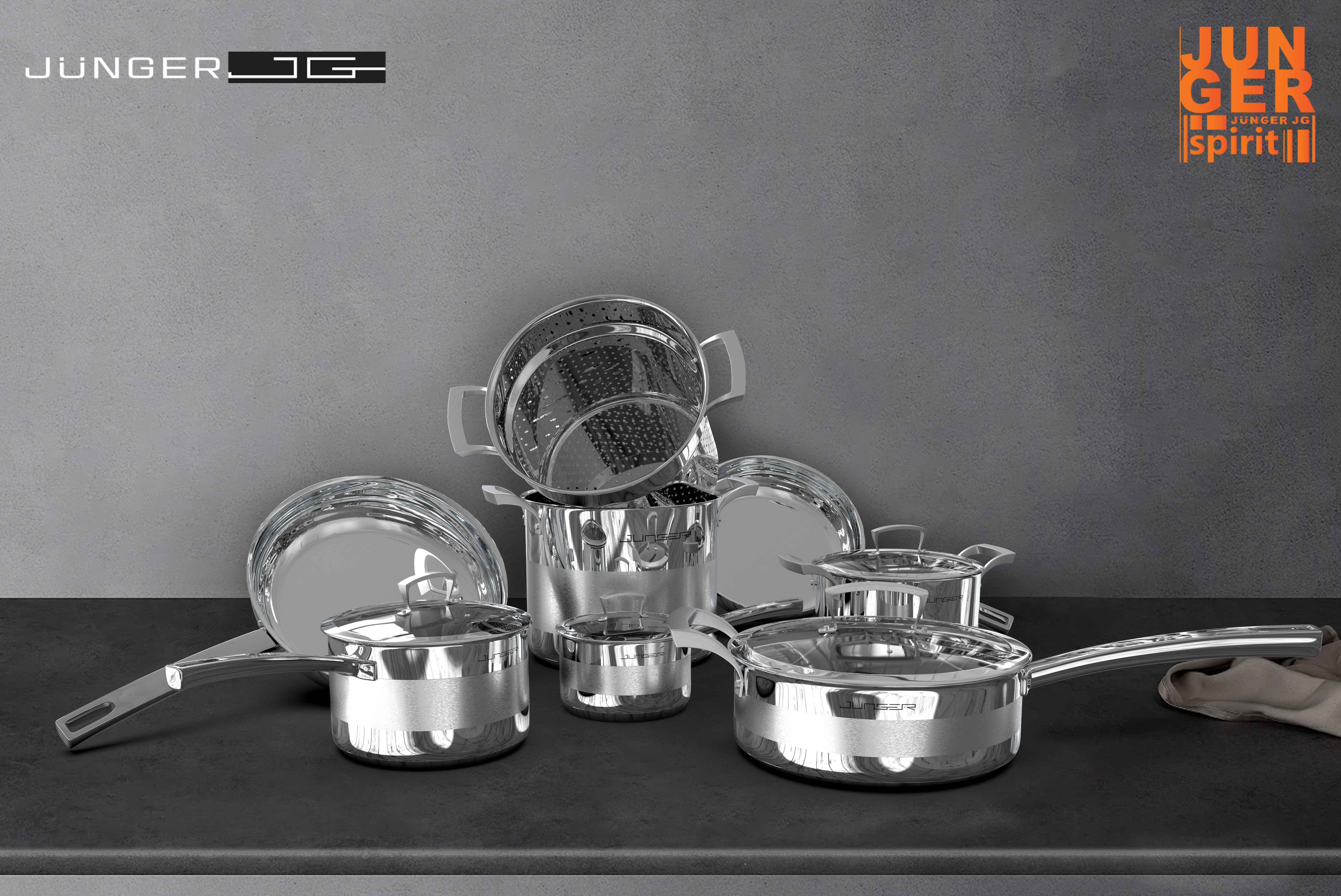Bộ nồi Junger dòng sản phẩm cao cấp sản xuất theo công nghệ chuẩn Châu Âu. Với cấu tạo 5 lớp giúp rút ngắn thời gian đun nấu, hội tụ cả yếu tố chất lượng và thẩm mỹ, giúp nâng cấp không gian bếp thêm phần sang trọng.