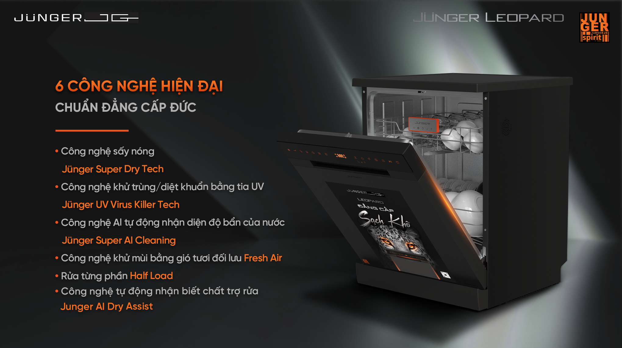 1. Hệ thống công nghệ rửa - sấy đa tầng: Các dòng máy cao cấp thường được trang bị hệ thống rửa áp lực cao, tay phun đa tầng và nhiều chế độ rửa chuyên sâu. Điểm nổi bật nằm ở công nghệ sấy tiên tiến như sấy ngưng tụ, sấy nóng JG Super Dry Tech, hoặc sấy khử khuẩn UV độc lập, giúp bát đĩa khô nhanh, hạn chế đọng nước, ẩm mốc và mùi hôi sau khi rửa. Trên thực tế, các dòng máy cao cấp như Junger còn phát triển hệ sinh thái công nghệ riêng với Super Dry Tech, AI Dry Assist, Super AI Cleaning…, nhằm tăng hiệu quả vận hành tổng thể. Nhờ cảm biến thông minh và khả năng điều chỉnh tự động, máy có thể tối ưu lượng nước, nhiệt độ và thời gian rửa theo mức độ bẩn thực tế. Khả năng khử khuẩn nâng cao kết hợp nhiệt độ và công nghệ hỗ trợ giúp giảm vi khuẩn tồn dư. Điều này giúp nâng cao hiệu quả làm sạch nhưng vẫn đảm bảo tiết kiệm tài nguyên hơn so với rửa thủ công hoặc các dòng máy phổ thông.